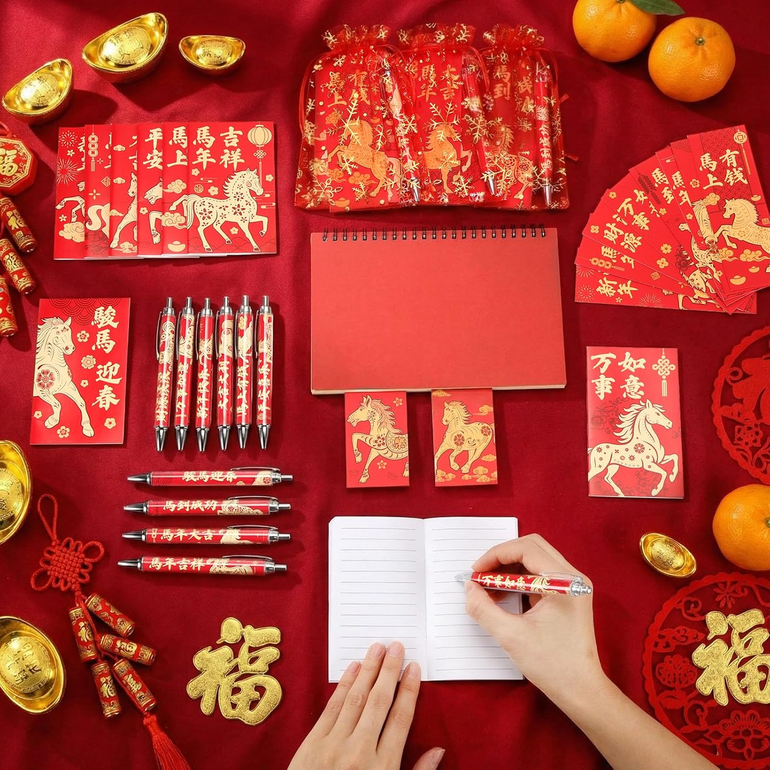 Features: Not a bad combination: Our Chinese Year of the Horse New Year notebook set has festive colors and is printed with various auspicious blessing patterns. It is suitable and easy to carry, meeting your various needs for different functions, such as daily writing, memory, calligraphy practice, and brainstorming. Practical supplies: Our gift set is suitable for home and office and can be applied to write, take notes and mark books, providing convenience for your daily life. Specification: Material: paper, plastic, organza Color: as shown in the picture Dimensions: Notepad: 3 x 5 inches Pen: 5.4 inches long Bookmark: approximately 2 x 6 inches Organza bag: 5 x 7 inches Package includes: 50 X 2024 Year of the Horse Small Pocket Notepad 50 x Motivational Gift Pen 50 Zodiac Dragon Bookmarks 50 x Organza bag Notes: Due to manual measurement, there may be slight errors in size. Due to different screen displays, there may be slight differences in color