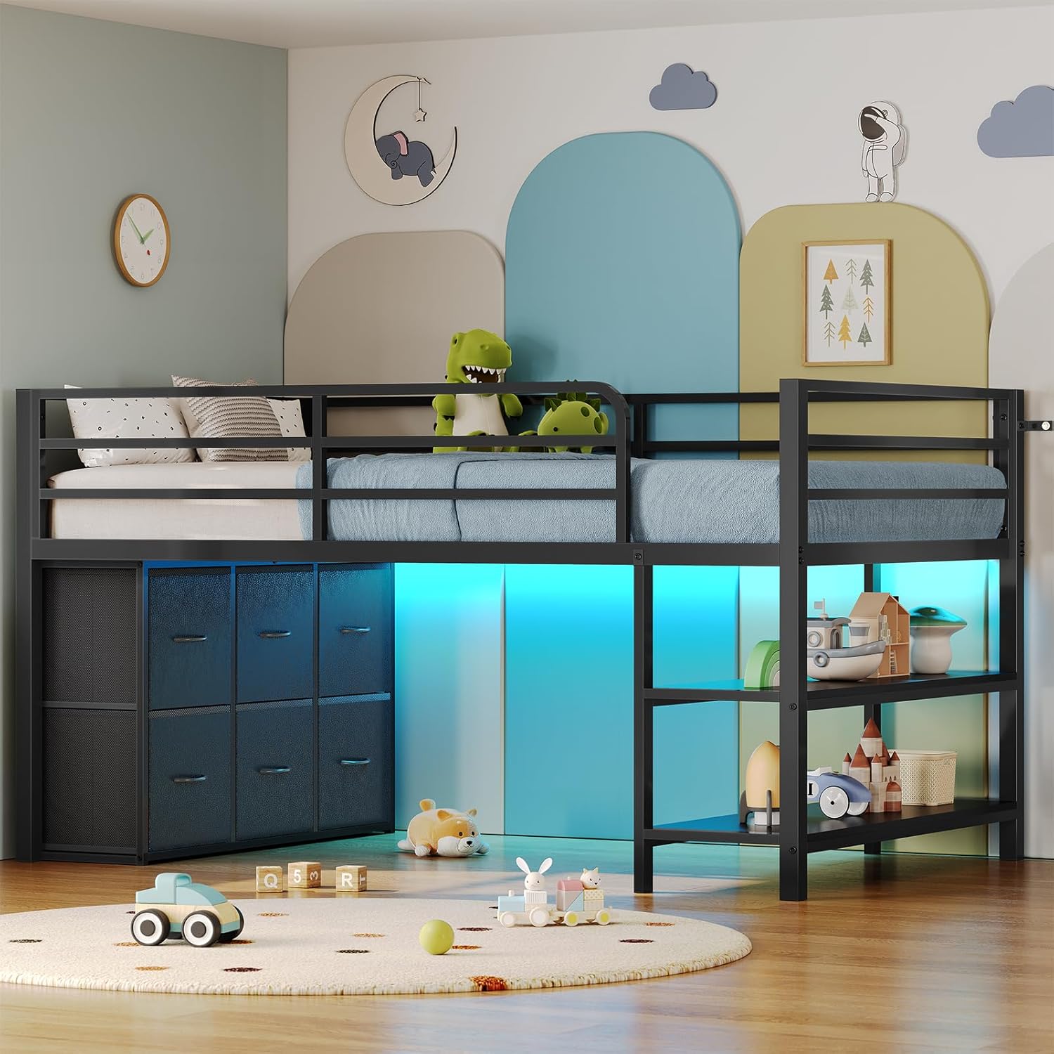 | Additional Features | No Box Spring Needed, 6 Fabric Drawers, 2 Storage Shelves, LED Lights, 15" H Safety Guardrail and Stairs, Space-Saving, Squeak Resistant |