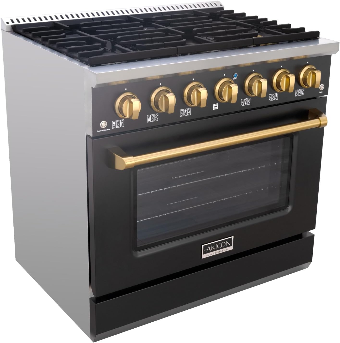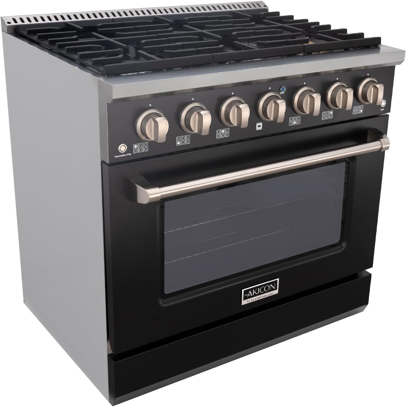 Akicon 36 Inch Freestanding Gas Range - Gas Oven Stove with 6 Sealed Burners, Heavy Duty Cast Iron Grates - 5.2 cu. ft. Capacity Rapid Convection Oven with Blue Porcelain Interior [Professional-Grade Gas Range Stove] Elevate your culinary experience with the Akicon Professional Gas Range Stove featuring 6 burners designed for all your culinary needs. Includes a powerful 20,000 BTU dual burner with simmer, 1 x 15,000 BTU burner, 1 x 12,000 BTU burner, and 2 x 9,000 BTU burners, along with a versatile 6,000 BTU burner. Perfect for searing, sautéing, steaming, boiling, frying, and simmering. [Efficient Convection Oven] The Akicon convection oven circulates heat and air rapidly, ensuring even cooking at lower temperatures and shorter times than standard ovens. With a generous 5.2 cu. ft. capacity, it accommodates a wide range of cooking methods, including Traditional Bake, Convection Bake, Defrost, Roast, Broil, Pizza, and Thanksgiving Turkey. [Built to Last] Crafted from corrosion-resistant, high-quality stainless steel, this gas range is built to withstand the rigors of daily cooking. Its heavy-duty continuous cast iron grates provide sturdy support for your cookware and food. The thick, durable door features a double-insulating glass window, and electronic ignition with auto re-ignition ensures safety and reliability. [Stylish Design, Easy Operation] The 36-inch gas range comes in various colors and finishes for a stylish match with your kitchen's design. The user-friendly metal front knob control panel provides effortless temperature adjustment for the oven and precise power control for the burners. [Trust in Quality] The professional-style gas ranges offer a 5-Year Limited Warranty and is ETL Certified for peace of mind. Akicon products come with a best-in-class customer service team to make your shopping experience smooth and comfortable.