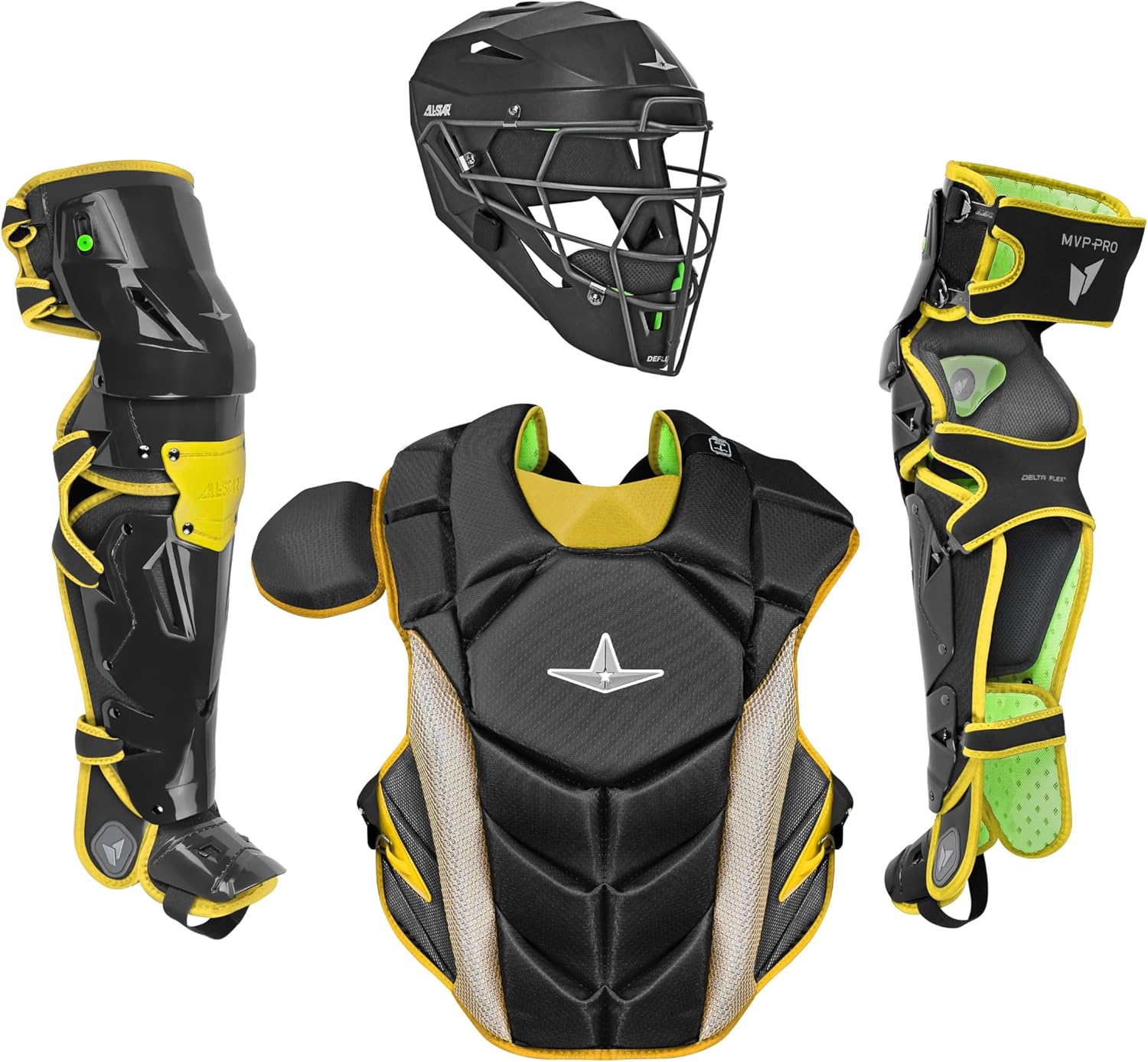 Developed with and trusted by the best catchers in the world. Revolutionary MVP-PRO Catchers Helmet features Deflexion shock hammocks to help disperse impacts and I-BAR-BSP Cage with extended backswing protection for coverage against wild swings. The MVP-PRO Chest Protector is SEI Certified to meet NOCSAE Standard for Commotio Cordis and features our revolutionary 3DU Bar technology for the most advanced blocking in the game. SHIFT technology on the leg guards moves with you to maintain thigh coverage in any receiving stance while the LINQ X Hinge System supports a full range of knee flexion. 3D Airmesh removable & washable pads promote a cool, comfortable, and soft padded feel. Headgear, chest protector, and leg guards treated with StinkStop to keep you fresh.