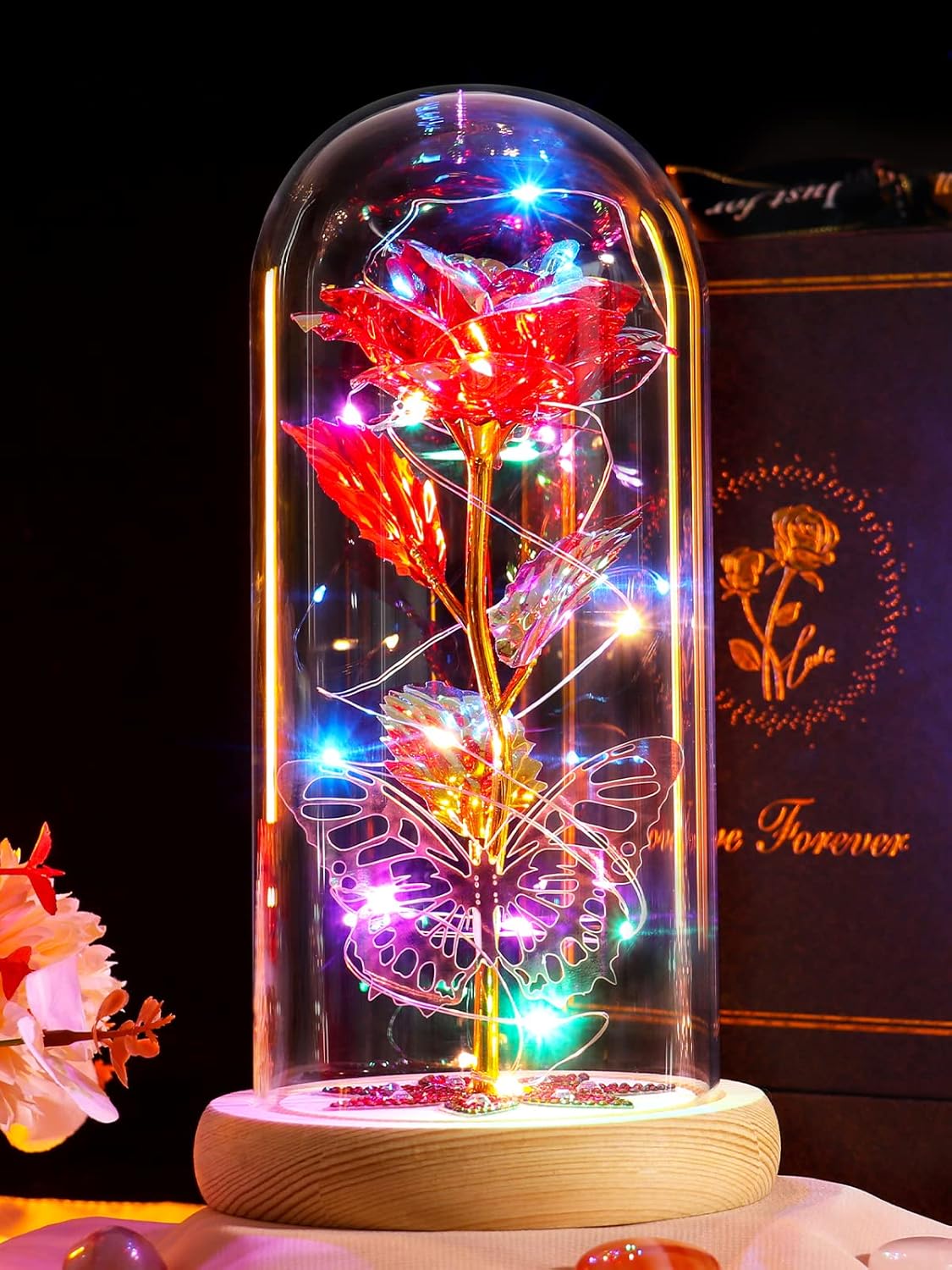 | Included Components | Black luxury gift box ,Crystal butterfly rose ,Glass dome,Diamond wood base,Colorful LED light string |