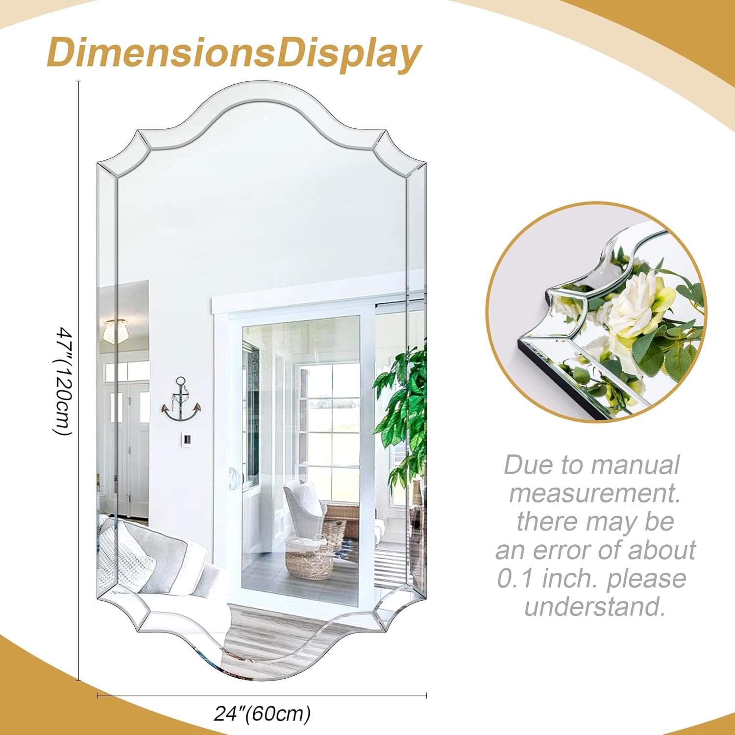| Additional Features | Arched shape, Beveled edge, Frameless |