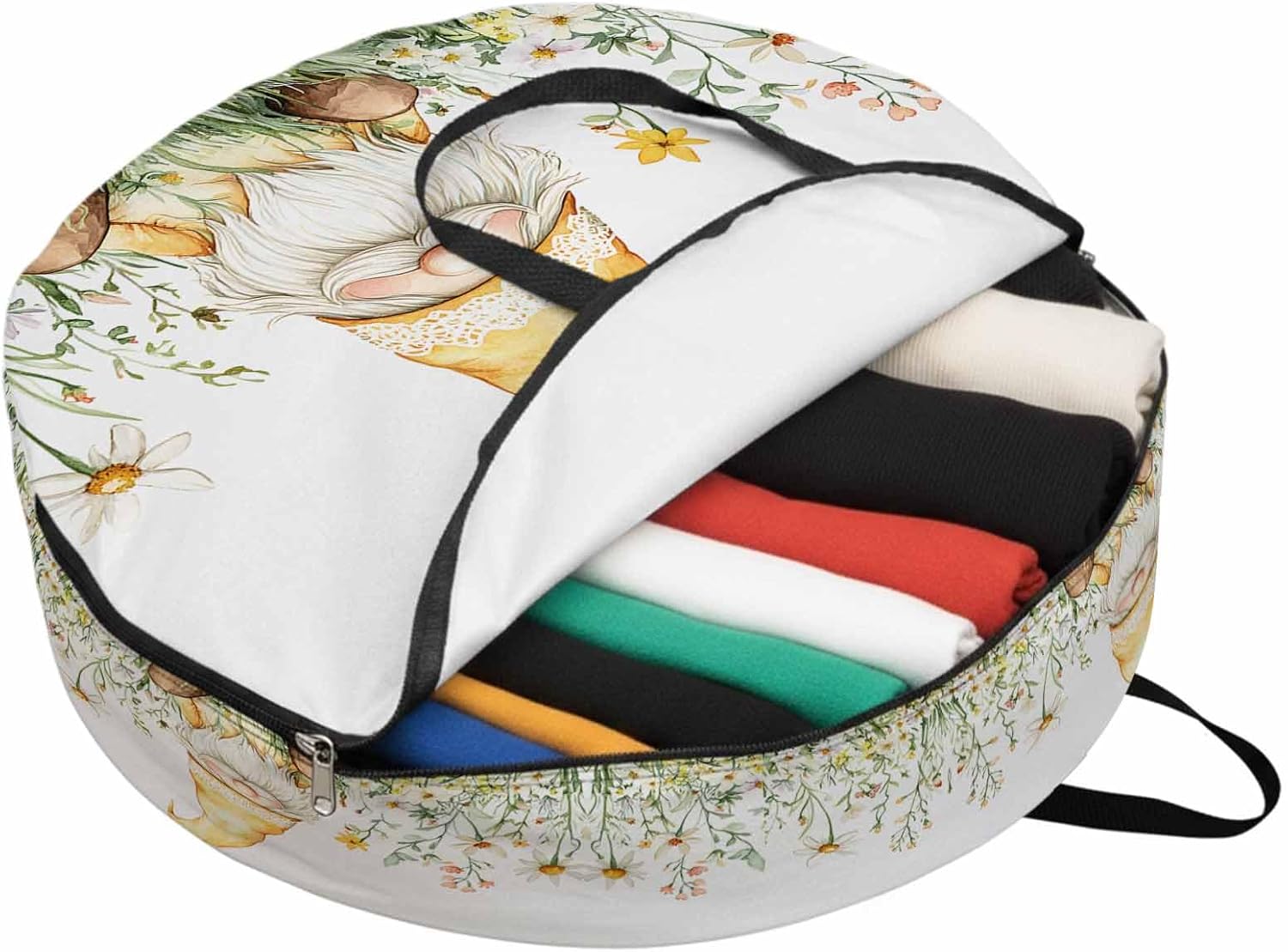 Reclaim Your Closet Space with the Round Storage Solution! Material: polyester Diameters: 24 inch, 30 inch, 36 inch Depth: 7 inches Package Includes: Round Storage Bag One Bag, Endless Possibilities: Whether you are swapping out your summer wardrobe, moving into a new dorm, or packing away holiday decorations, this bag has you covered. The circular design is uniquely suited for: Bedding: Comforters, quilts, sheet sets, and oversized pillows. Clothing: Winter coats, sweaters, and bulky ski gear. Home Decor: Holiday wreaths, garlands, and floral arrangements. Outdoor Gear: Camping blankets, sleeping bags, and beach towels. Dual Zippers: The high quality double zipper design allows the closet organizer to open wide from both sides, making it effortless to load and unload even the bulkiest comforters or wreaths. Reinforced Handles: Sturdy, reinforced handles are securely stitched to provide extra strength and a comfortable grip when carrying heavy loads or pulling the bag from under a bed. Clear Label Pocket: A transparent built-in label holder allows you to quickly identify the contents of each bag without ever having to unzip it, keeping your storage perfectly organized.