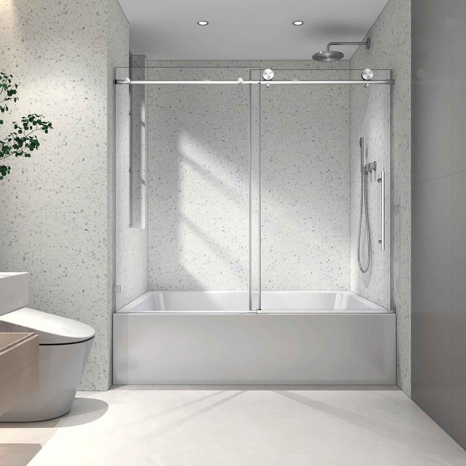 Transform your bathroom with the Favfurish 54"x76" frameless double sliding shower door, engineered for premium safety and adaptability. The 8mm SGCC-certified tempered glass features dual nanotechnology: a front explosion-resistant layer and a back self-cleaning coating, ensuring both protection and low upkeep. Customize the width from 50’’ to 55’’ for flexible installation, achieving up to 25.5’’ clearance (detailed diagram included). The industrial 304 stainless steel pulley system guarantees silent, wobble-free sliding even after 50,000+ uses, while the soft-close mechanism accommodates 3/8’’ wall variations. Perfect for upgrading bathtub enclosures or creating walk-in spa showers, this matte black glass shower door installs effortlessly in under 1 hour. Its reversible design suits any layout, and the scratch-resistant surface maintains elegance in high-traffic bathrooms. Package includes: Step-by-step guide, installation video, and all hardware. Comply with ANSI/SGCC standards while embracing modern minimalism – redefine your daily routine with professional-grade reliability.
