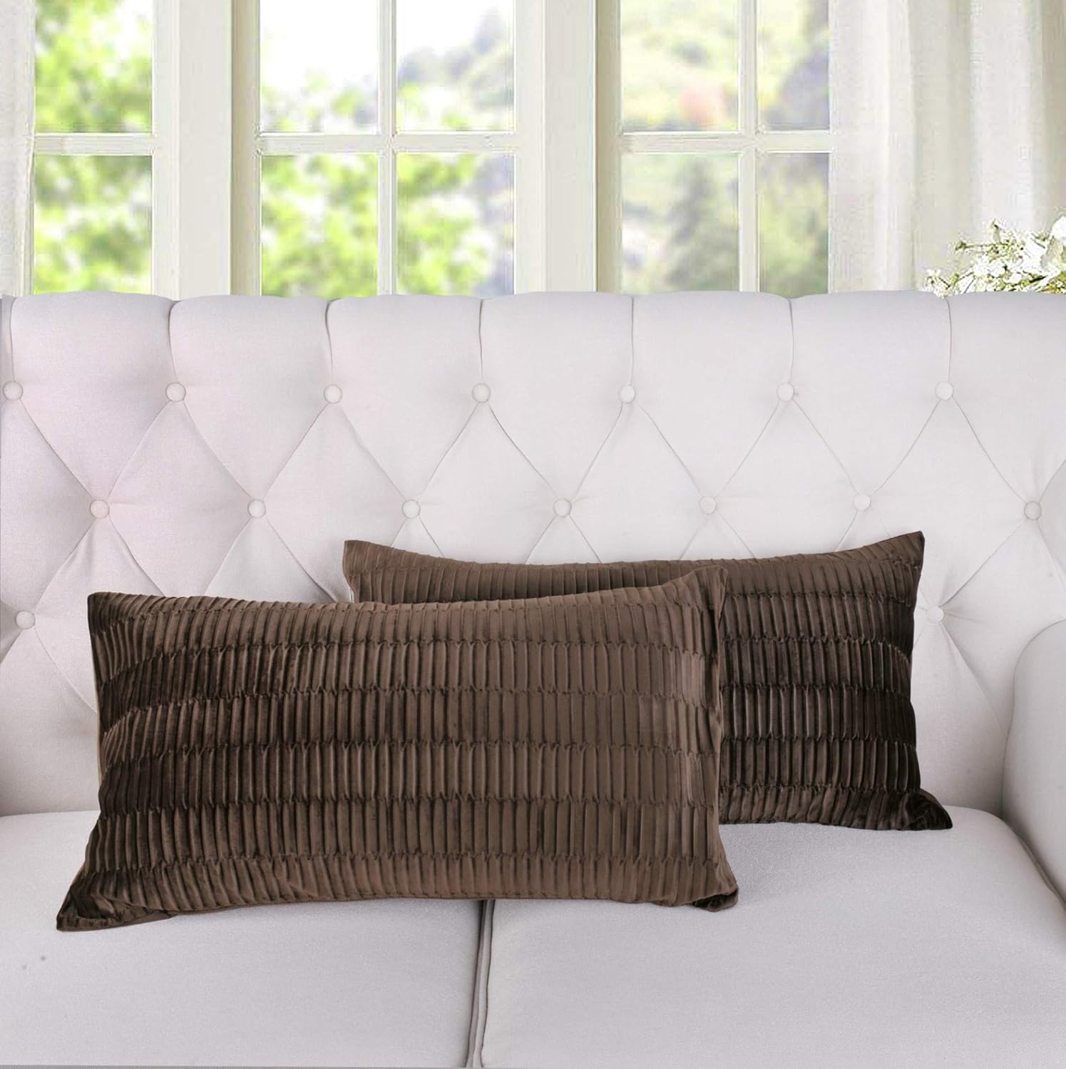 Pleated Velvet Pillow Shells quickly transform your old pillows into something new, exciting, and fresh! The crisp pleated design offers a modern quality that adds a layer of subtle texture to your couch, bed or armchair. Each pillow shell measures 26 x 26 in. and is tailored for an 18x18 in. insert. (Inserts Not Included) Solid colors create versatile throw pillow covers that complement an array of home furnishings or bedding. Set of shells comes with a product card and are perfectly folded and inserted into a small, clear polybag for easy gift giving. 100% Polyester luxurious, high-grade micro-suede texture features hidden zipper closure for a seamless appearance all the way around. In-house manufacturing cuts the middleman bringing you the affordable luxury you deserve. Care: Remove the inserts from the shells and machine wash, separately, using cold water on a gentle cycle. Tumble dry on lowest heat setting to avoid heat damage. Pillow shells are heat treated to protect against shrinkage after washing and drying and stays the same as new, after every wash. All products are built to last a lifetime with proper care.