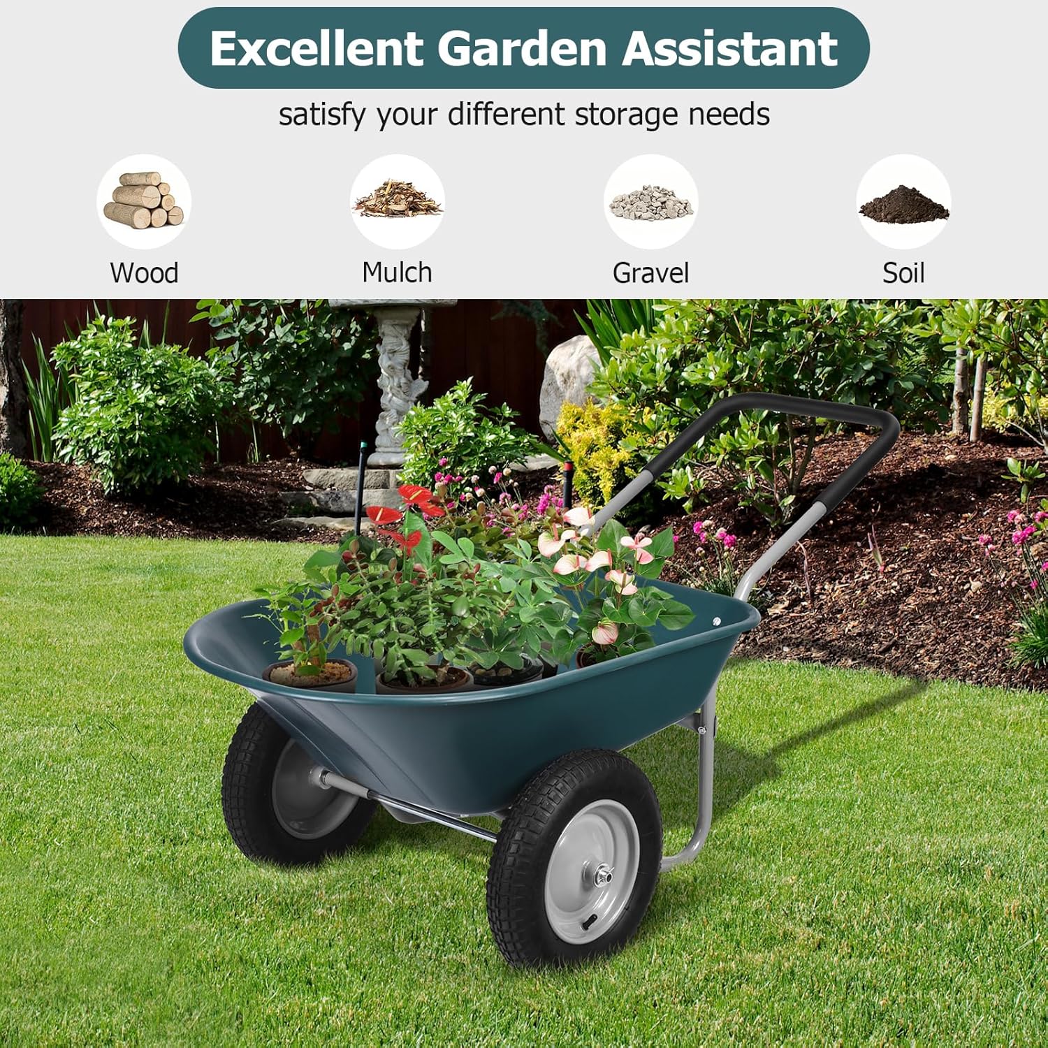 Description: If you need a versatile garden cart for transporting heavy items, our 2-tire wheelbarrow is the ideal solution. Constructed with a sturdy metal frame and premium PP material, this garden cart ensures a solid and stable structure for long-lasting use. With a hauling capacity of up to 330 lbs and 5 cubic feet of space, it makes it effortless to transport garden tools, equipment, plants, and more. The flexible handle allows for easy maneuvering and dumping of heavy objects. Additionally, the dual wheels ensure smooth and stable movement on various types of terrain. This garden cart is the perfect tool to meet all your gardening needs efficiently and effectively. Features: Carries plants, gravel, wood, dirt, mulch, tools and more The perfect utility tool for use in the yard, on the lawn, in the barn or on the farm Large hauling capacity can well suit gardening needs Sturdy metal construction and PP material ensures a long service life Easy to move with 14” pneumatic tires Long handle for easy direction control and dumping of heavy loads Easy to assemble according to detailed instructions Specifications: Color: Black/Green Material: Steel, PP Overall Dimension: 57”x 26” x 26” (L x W x H) (L x W x H) Size of Tray : 36” x 25” x 11.5” (L x W x H) (L x W x H) Net Weight: 23 lbs Weight Capacity: 330 lbs Package Includes: 1 x 2-tire Wheelbarrow 1 x User Guide