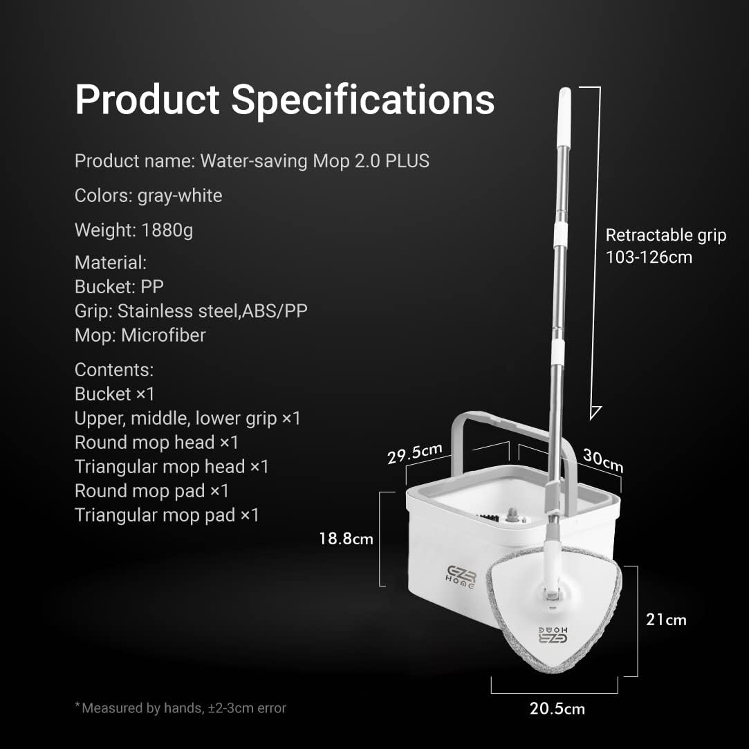 EZR HOME Floor Mop comes with a patented filterable water system that makes every spin or cleaning highly effective. The cleaning tools system of the mop bucket separate dirty water jets out filtered water and the brush scrubs all dirt and hair away. Your hands won't get wet because you can wash the pads in the bucket without a washing machine for this mop bucket with separate dirty water. The ultra-absorbent microfiber mop pad doesn't consume gallons of water to clean the floor. Mop with bucket with spinner removes stubborn dirt while being machine washable and easily replaceable. The cleaning cloth absorbs the water immediately and does not leave streaks. The mop bucket with wringer has some unique features as below: Adjustable Handle: The handle mop set with bucket is made of stainless steel. The 360° spin mop system with round and triangular mop head allows easy cleaning of the underside, corners, and spaces of furniture. Spin Mop and Bucket Set with wringer set: There is a spin wring-out system in the bucket for rotary dirt washing which separate mop water bucket.