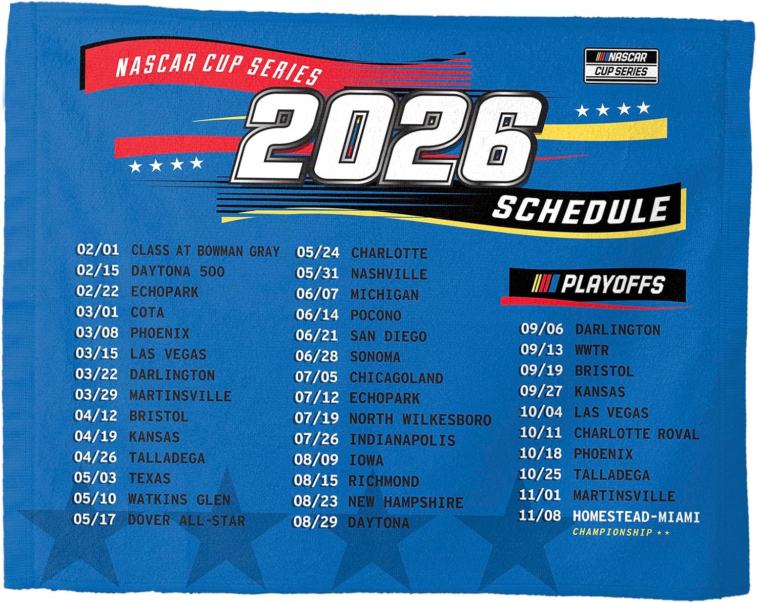 Bring high energy excitement to every race day with this NASCAR rally towel. Officially licensed and designed for passionate fans, it features bold racing inspired graphics that deliver authentic motorsports style. Lightweight and easy to grip, this towel is perfect for waving in the stands, celebrating big moments, or adding atmosphere to watch parties and tailgates. The 15 x 18 inch size makes it compact and easy to carry while still providing great visibility when cheering. Made from durable polyester, it is built for repeated use and easy care. Whether at the track, at home, or on the go, this rally towel is a must have accessory for showing your NASCAR pride.