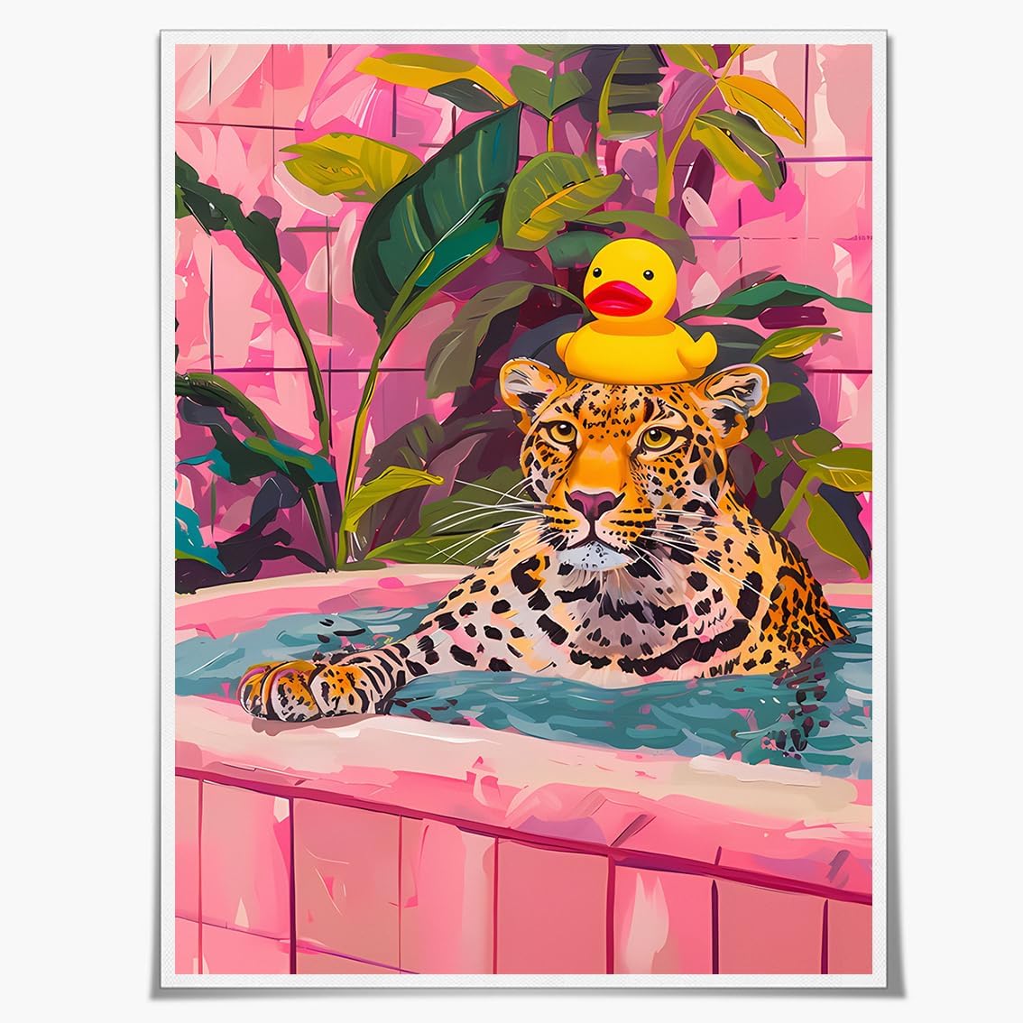Add a touch of humor and vibrant style to your home with this Leopard in Bathtub Maximalist Wall Art. This delightful artwork features a playful leopard lounging in a bathtub alongside a duck, set against a bold orange and pink color scheme. Perfect for maximalist and dopamine decor enthusiasts, this piece brings a lively and whimsical energy to any space, making it an ideal choice for bathrooms, living rooms, or bedrooms. Printed on premium canvas, this artwork is not only visually striking but also designed for durability. Its fun, quirky design is perfect for those looking to inject a bit of humor and personality into their home decor. Whether as a standout piece in a maximalist bathroom or as part of a larger gallery wall, this colourful cheetah painting will surely brighten up any room.
