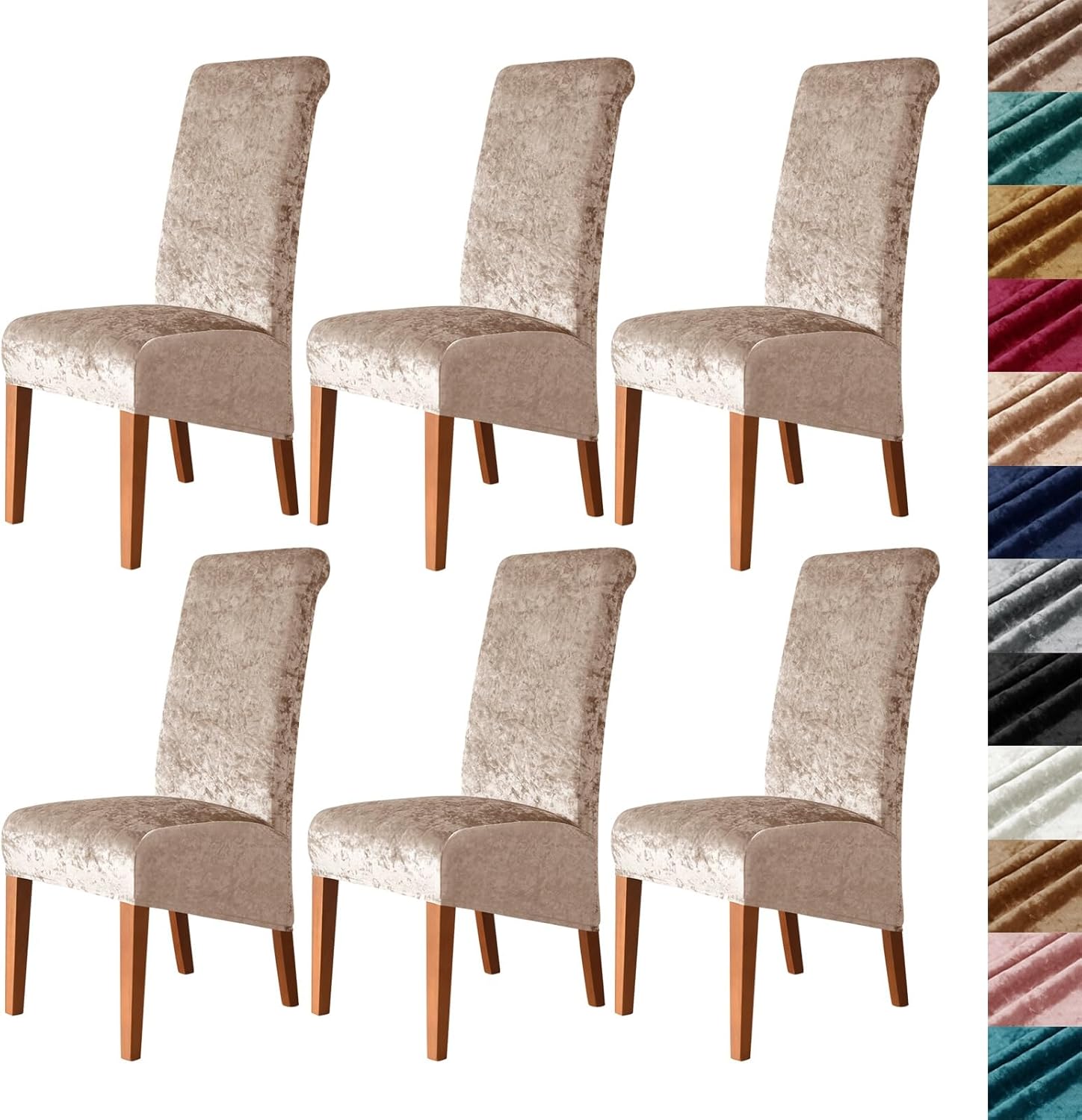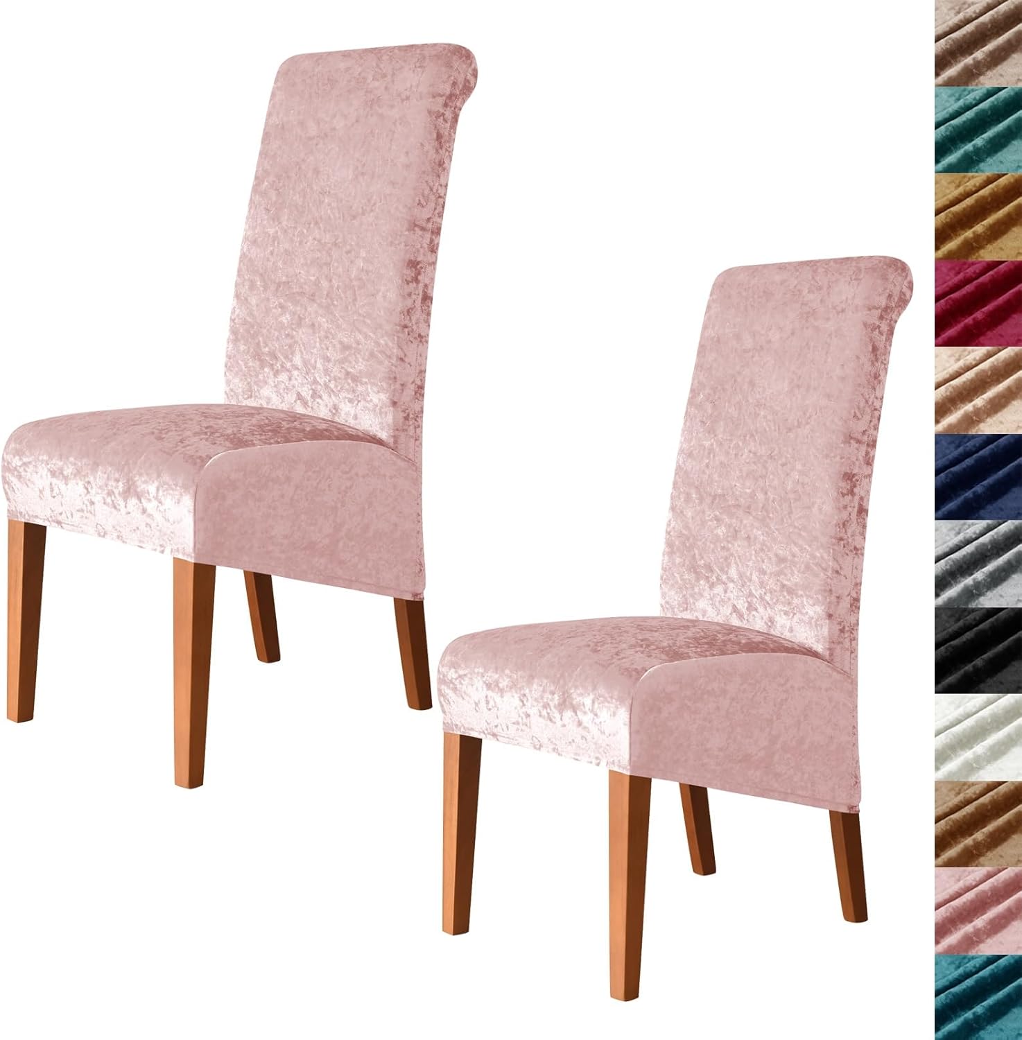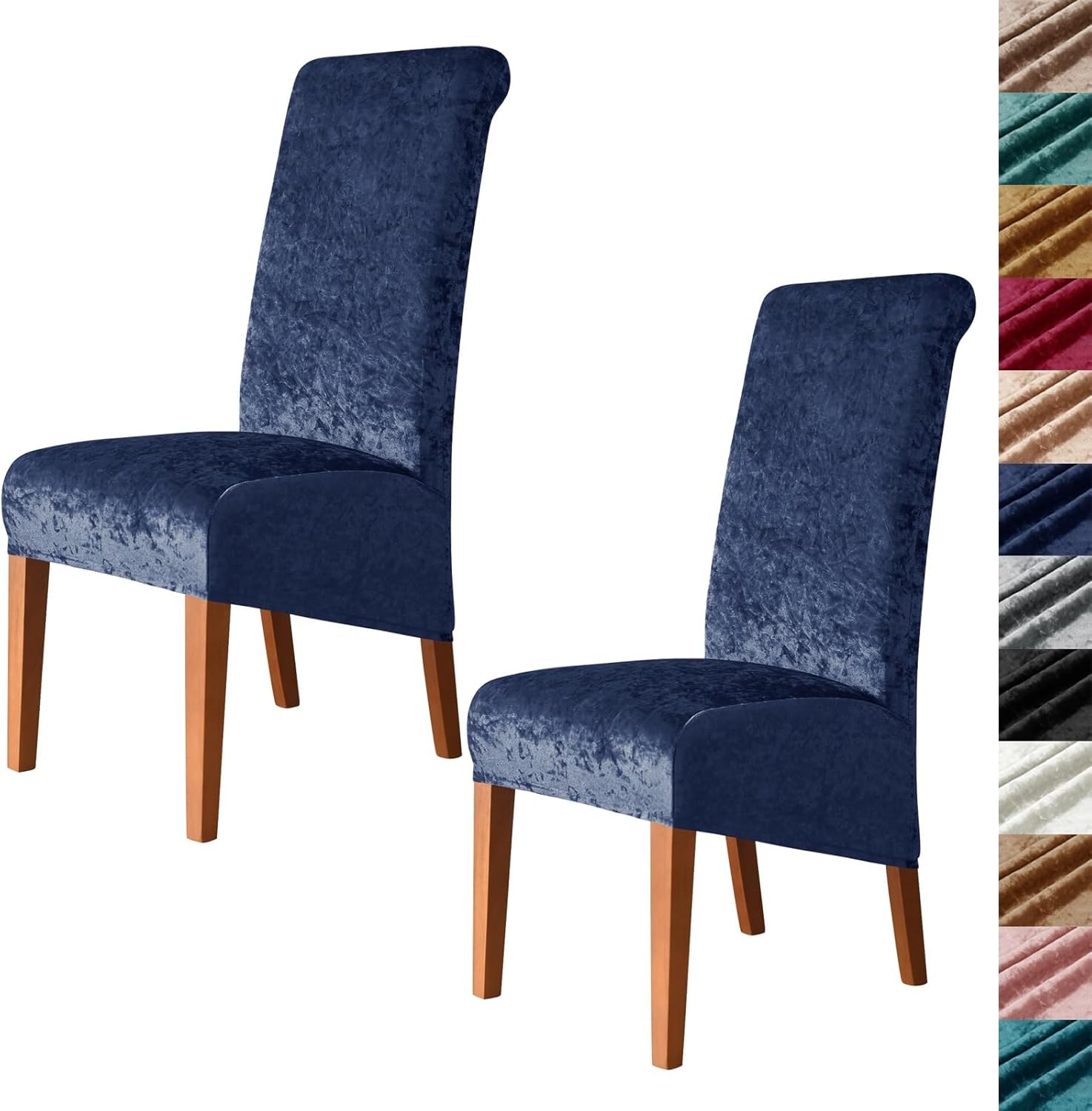 ---> Product Name: velvet high back large chair cover slipcover for dining room---> Material: polyester and spandex ---> Color: 12 color---> Suitable Size: The XL/oversized extra large size dining chair covers fit:Back height: 24-30 inches ( 60-75cm );Seat width: 14-19 inches ( 35-48cm );Seat depth: 15-19 inches ( 38-48cm );Seat thickness: 1.5-5.5 inches ( 4-14cm );Please measure your chairs before choosing our chair covers.Besides, elastic band at the bottom makes the chair slipcovers anti-slip and stay in place.---> Easy To Install: 1. Stand behind the chair, cover the chair from back to front, and adjust the cover to fit the back of the chair smoothly.2. Let the cover fall to the bottom, covering the flat surface of the seat, so that it is aligned with the seam of the cover.3. Tuck the excess part of the cover into the gap of the seat to make the fabric tighter and keep the cover firmly fixed.4. Smooth out the wrinkles of the cover.---> Package Contents: 1 x Set of Chair Cover (Chair Not Included) or2 x Set of Chair Covers (Chair Not Included) or4 x Set of Chair Covers (Chair Not Included) or6 x Set of Chair Covers (Chair Not Included)---> Kind Tips: 1.Please measure your chairs before choosing our chair covers.Please allow slight measurement errors due to manual measurement.2.Due to the difference in light and display,the color may be slightly different from the picture and the product.3.If you have any questions,please contact us via email and we will be happy to assist you.